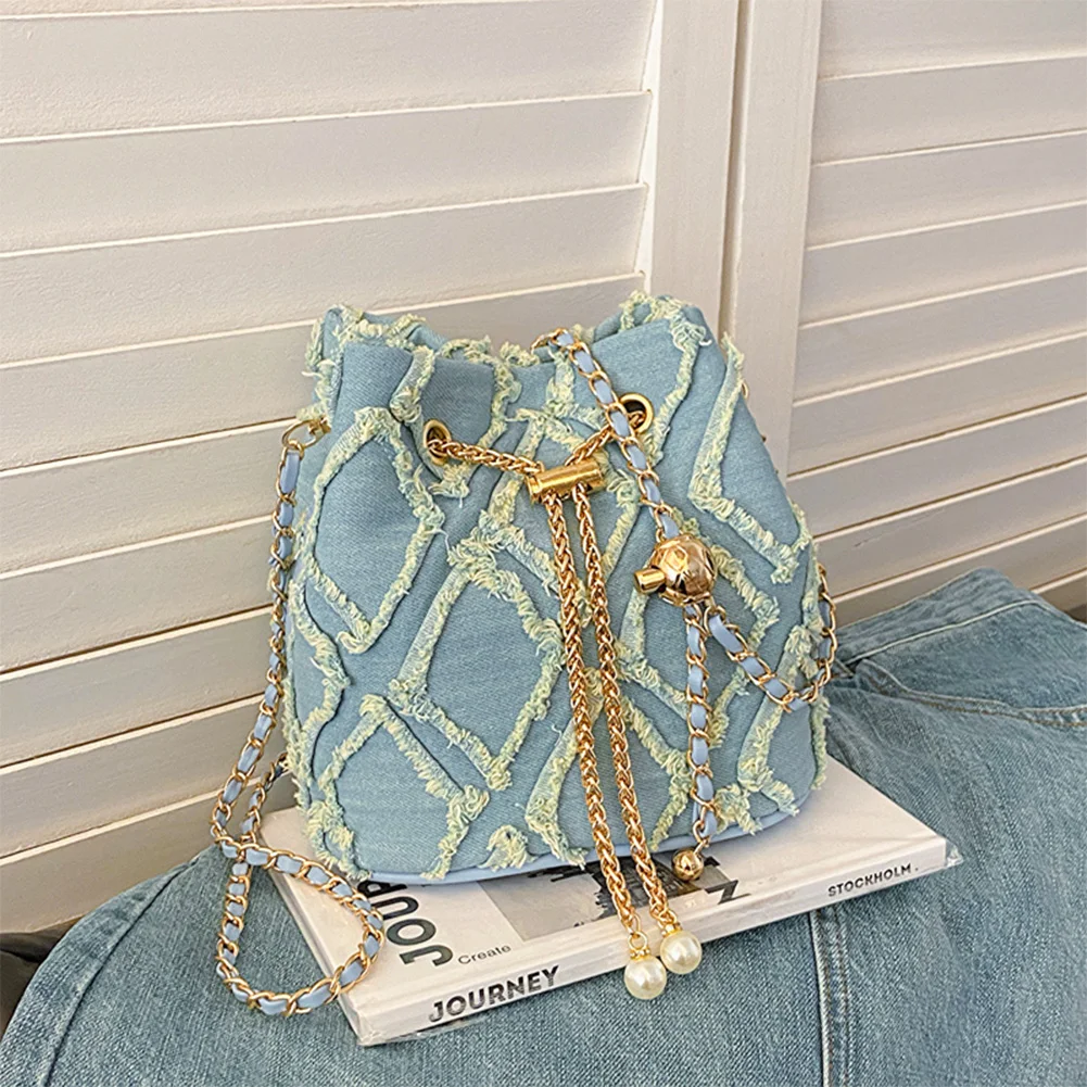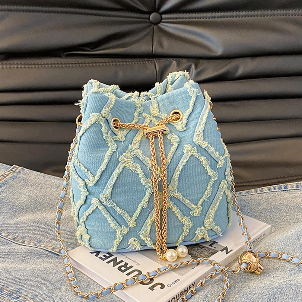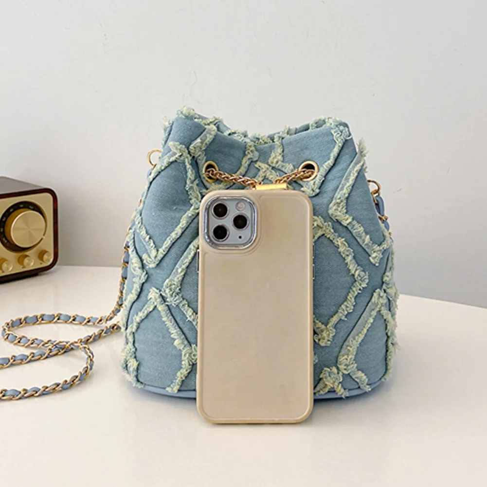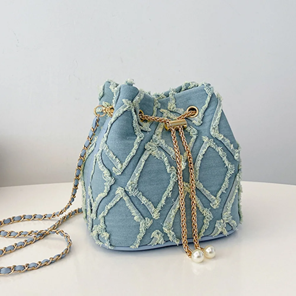 Denim Bucket Bag Diamond Pattern Women Crossbody Bag Drawstring Shoulder Bag Adjustable Strap Hobo Bag Travel Bag