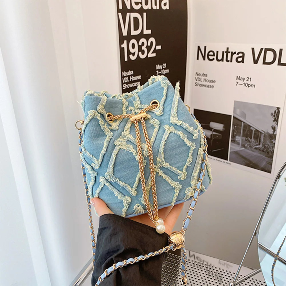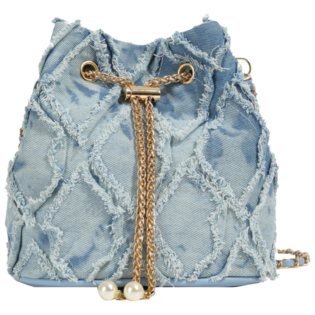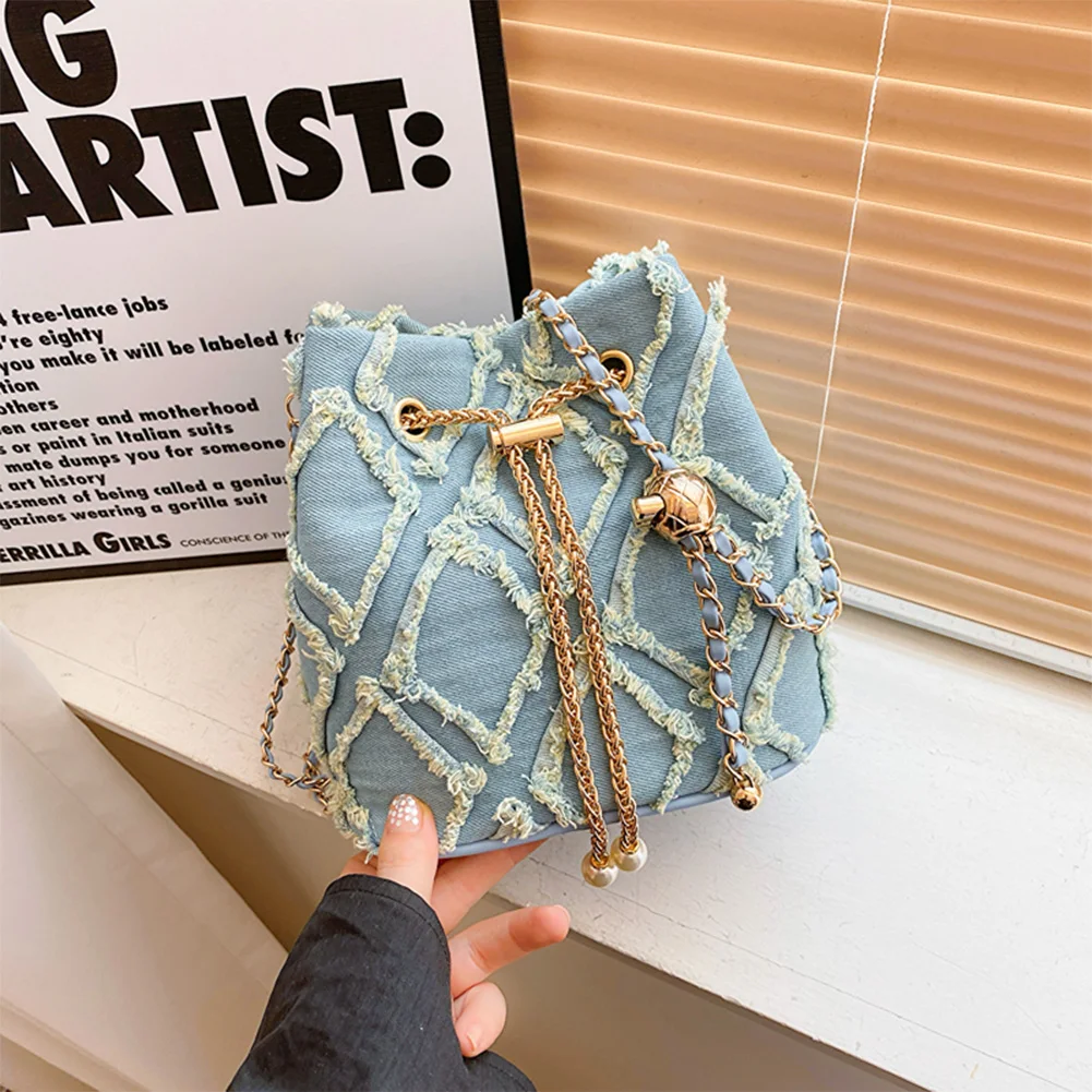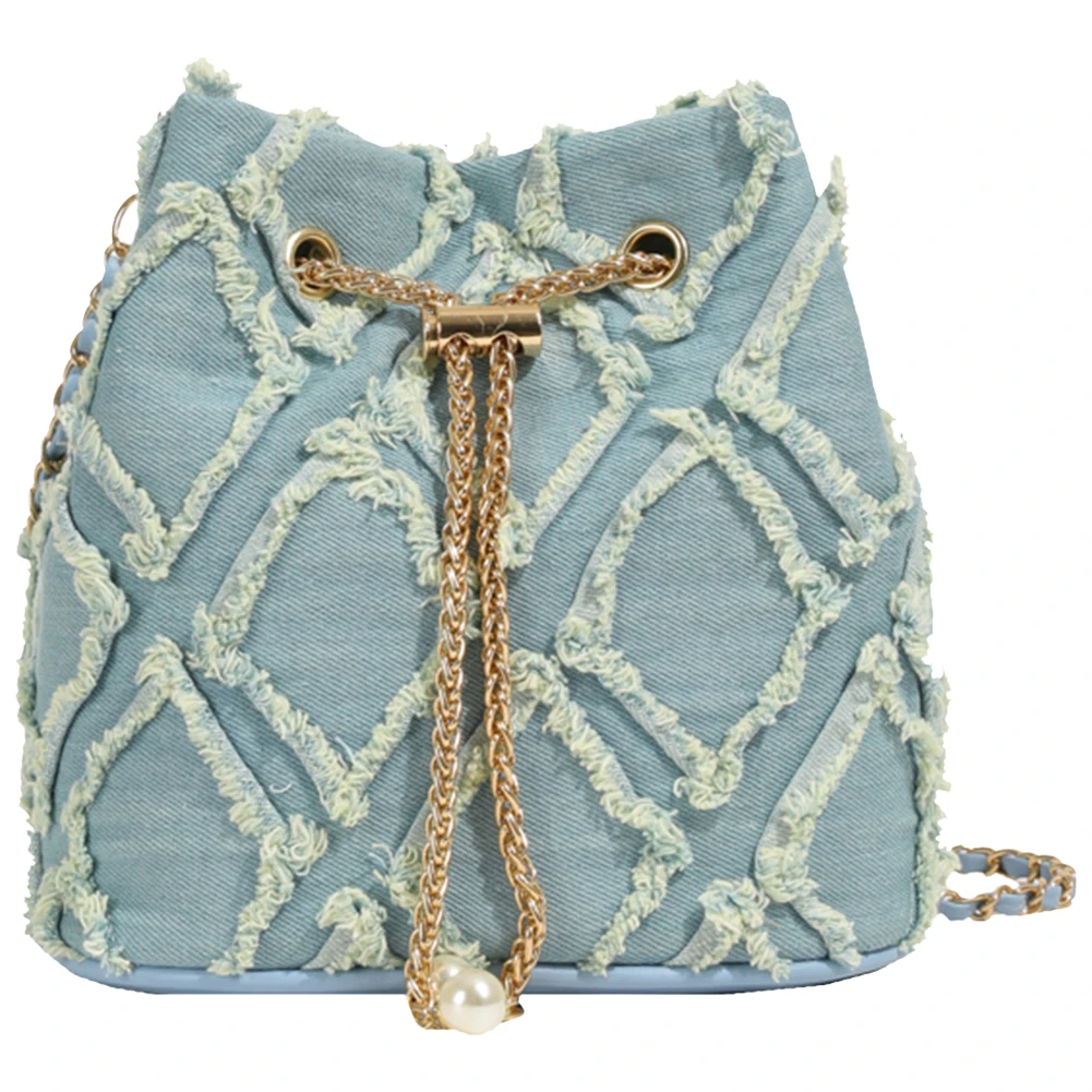 Denim Bucket Bag Diamond Pattern Women Crossbody Bag Drawstring Shoulder Bag Adjustable Strap Hobo Bag Travel Bag