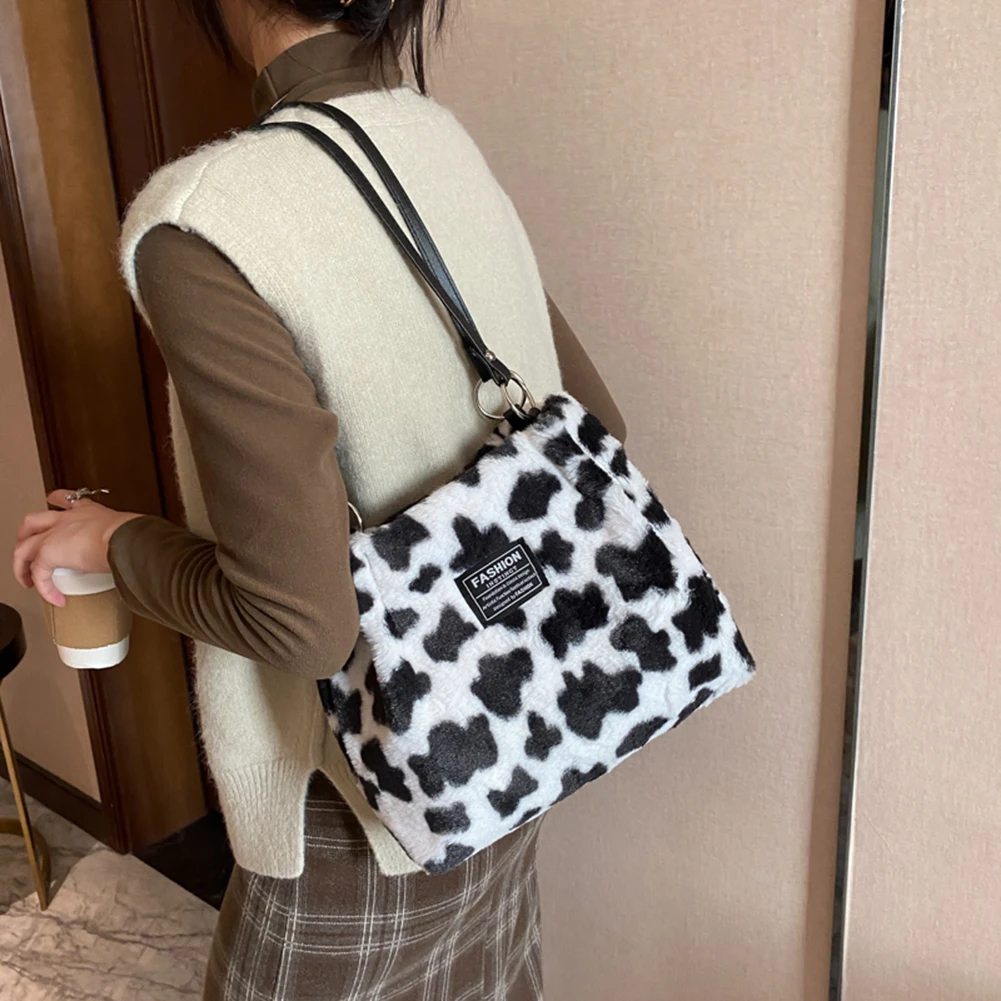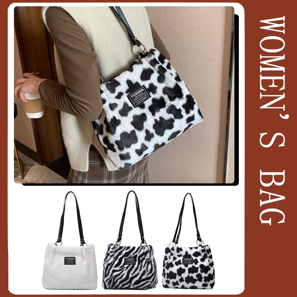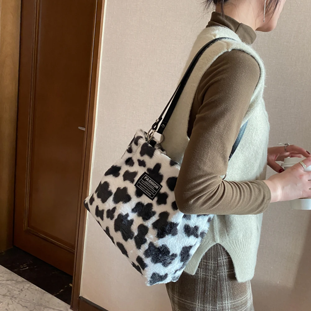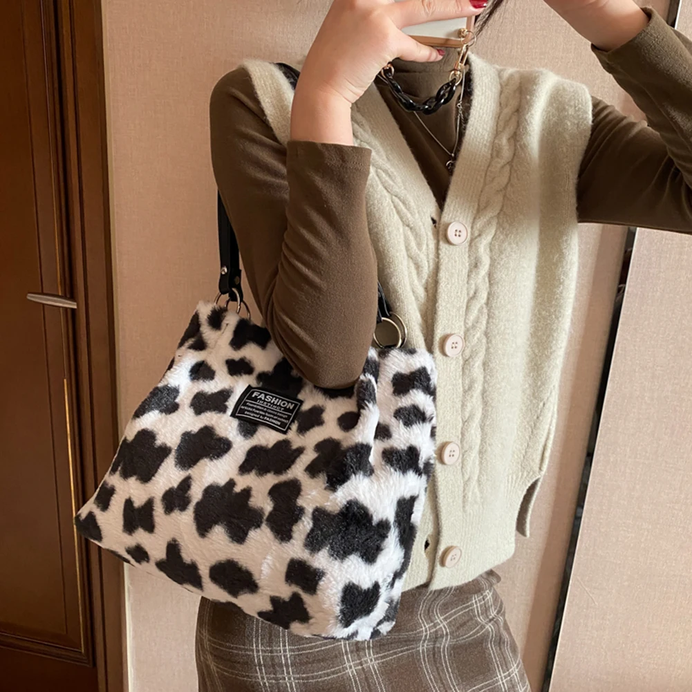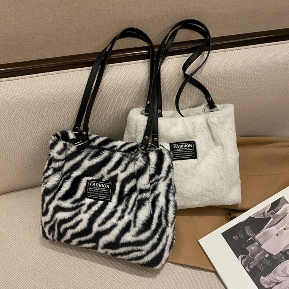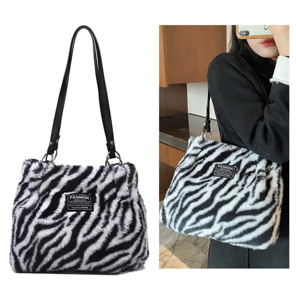 Women Faux Fur Handbag Zebra/Cow Texture Furry Shoulder Bag Hobo Fluffy Satchel Bag Cute Tote Bag Girl Stylish Purse
