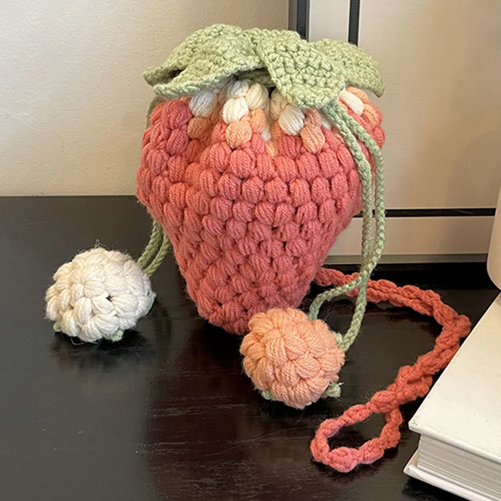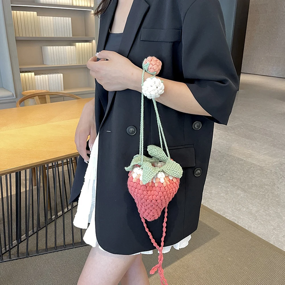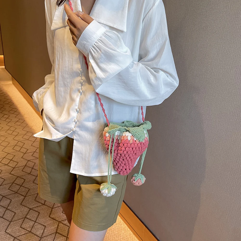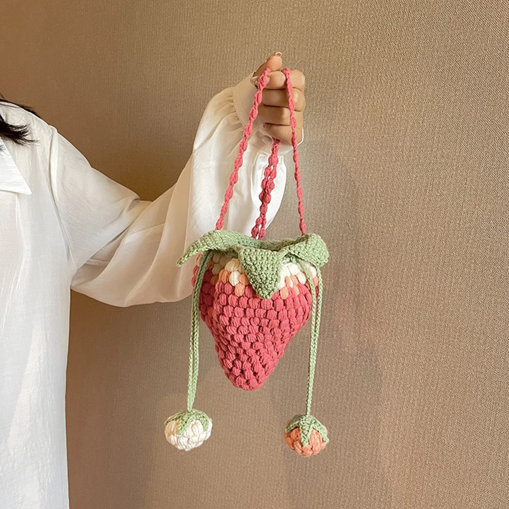 Women Kawaii Tote Handbag Versatile Strawberry Crossbody Bag Casual Adorable Shoulder Bag DIY Cartoon Cute Knit Sling Purse